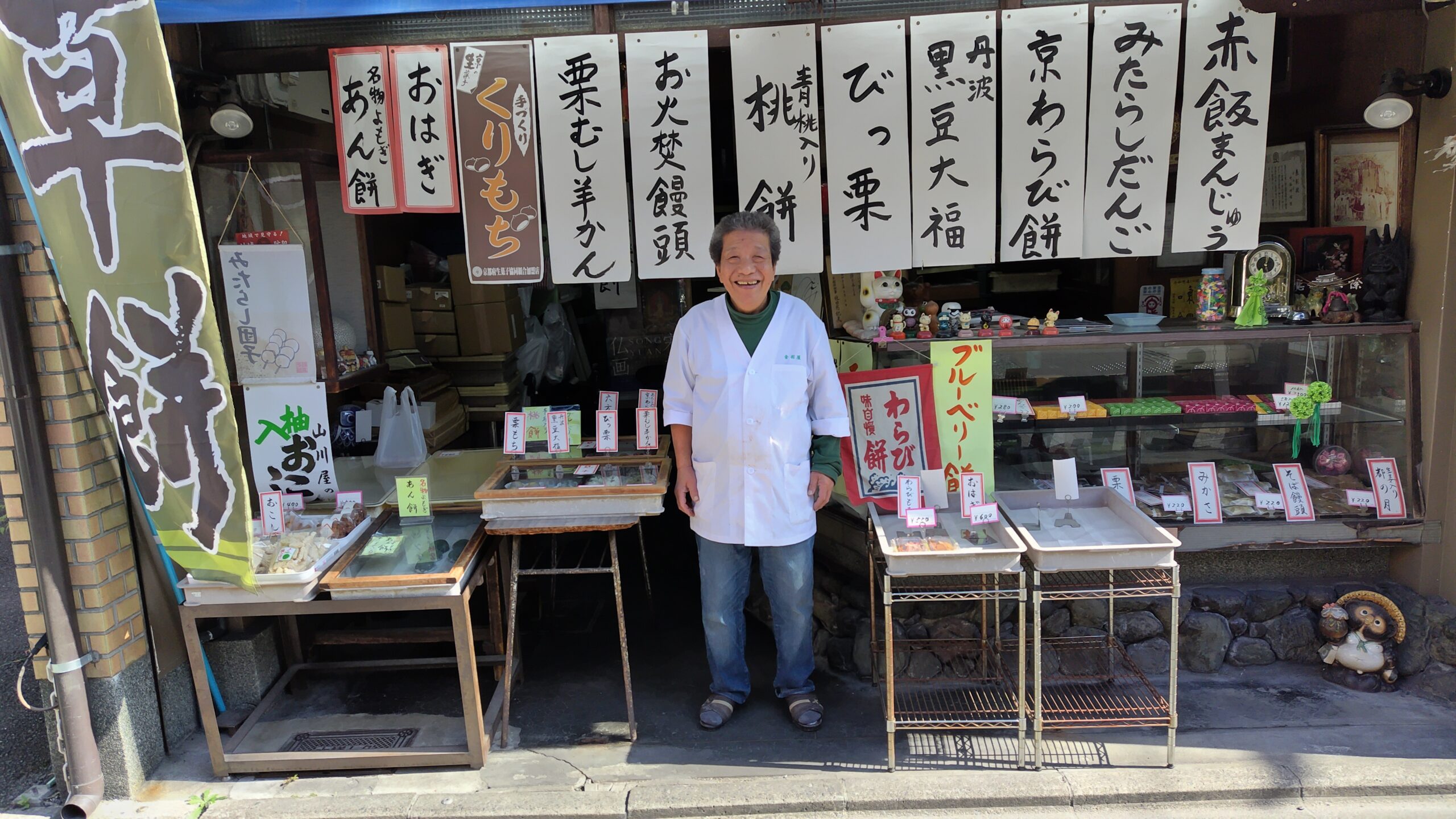 店頭に並んだ四季折々の綺麗な和菓子とお店のご主人の笑顔が道行く人たちの眼を惹きつけます。